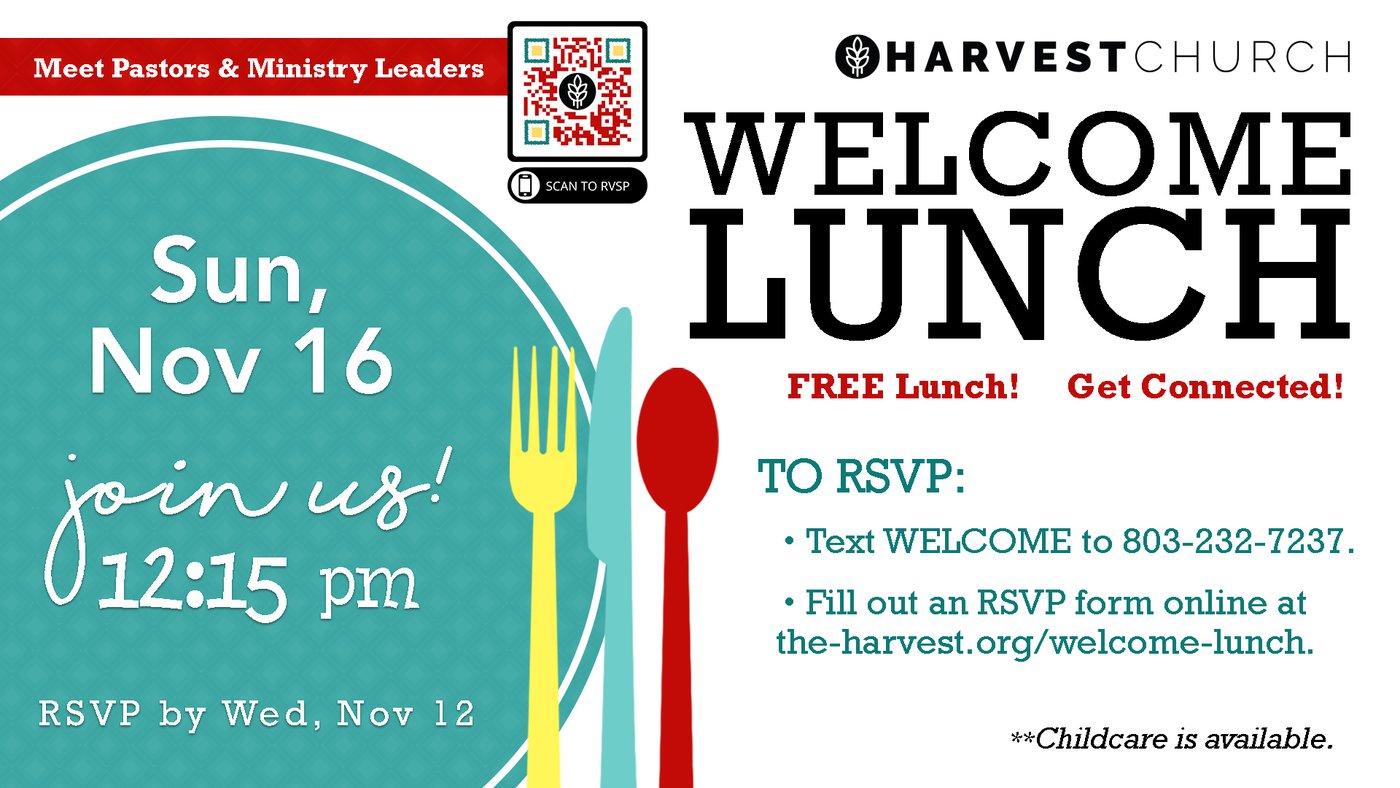 If you are new at Harvest or have been a guest with us recently, we hope you will make plans to attend one of our Welcome Lunches. It’s a casual afternoon that allows you to meet others and learn more about Harvest while enjoying a meal on us.